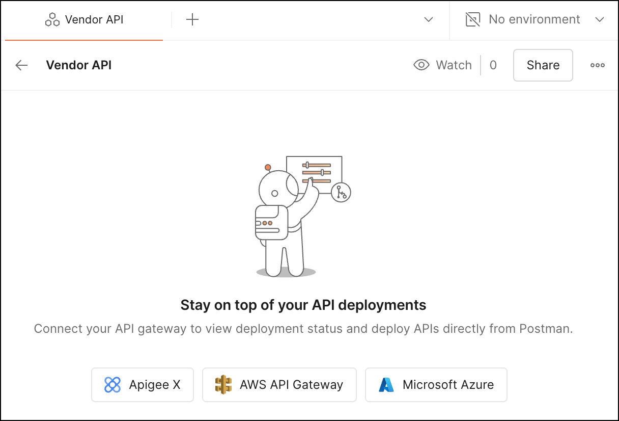 Many API management vendors lock you in to use their proprietary API gateway, limiting your ability to choose the best API gateway for the job. Postman ensures you can choose the API gateway you want, seamlessly integrating with Apigee X, AWS API Gateway, and Microsoft Azure API Management.